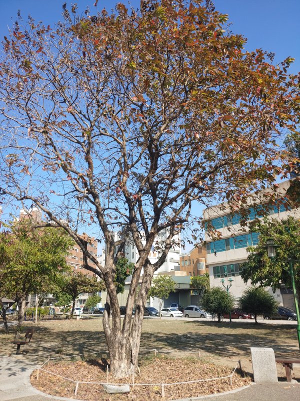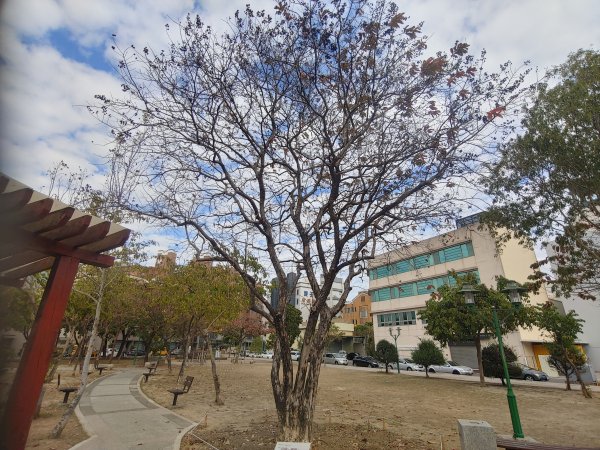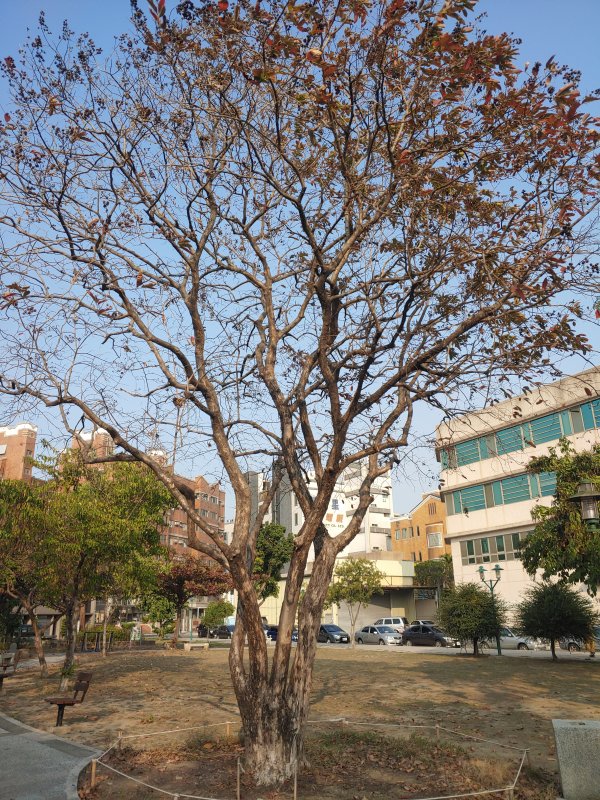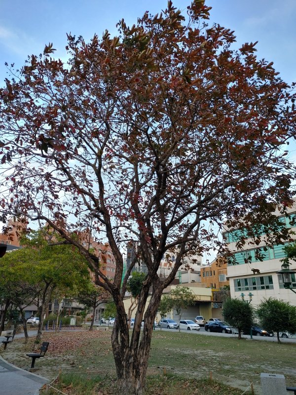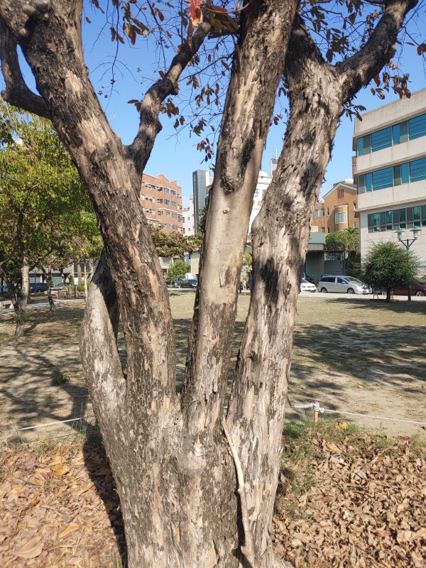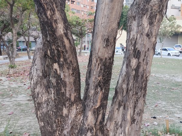 2025/0207 更新拍攝進度。可先觀察到大花紫薇棲地裡面維持著有落葉跟草的空間,因為留下草可以卡住落葉的飛揚,進而將葉子留在樹木的空間裡,形成一個可活化土壤又可減少人為掃除的方法。二月份可看出大花紫薇已有到變葉的後期,也將開始有新綠葉的轉變。樹幹明顯換掉去年的黑樹皮。