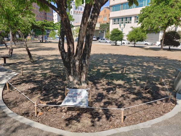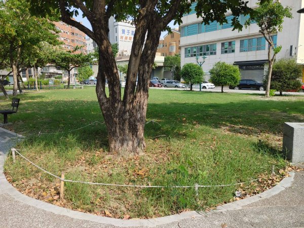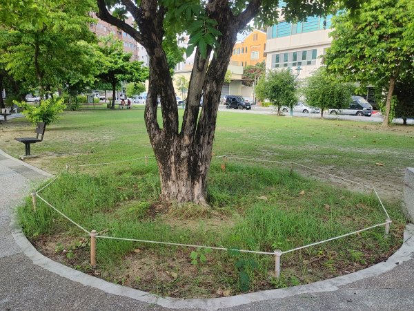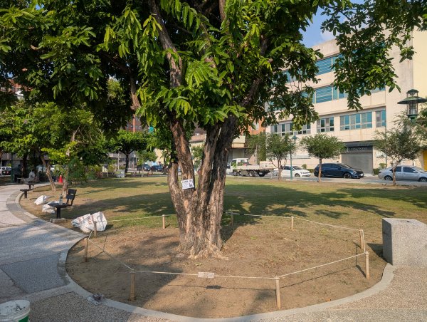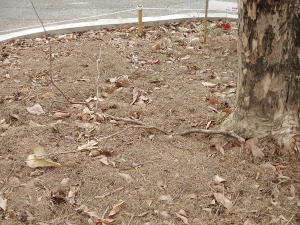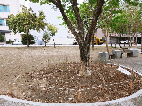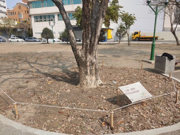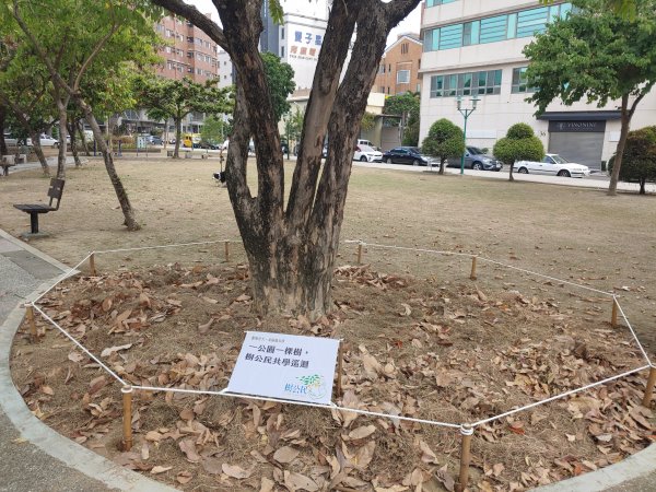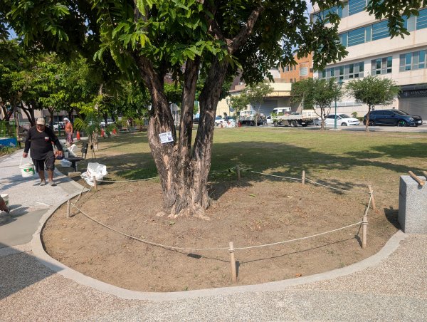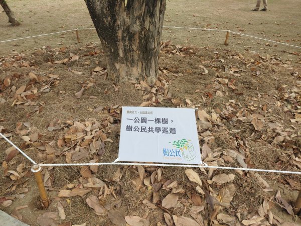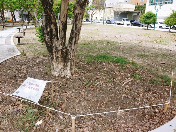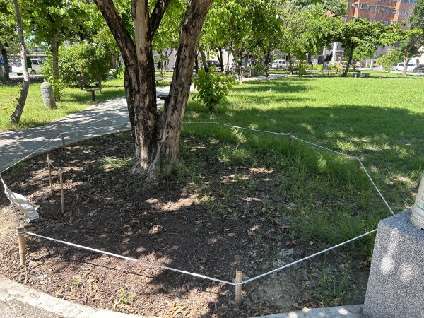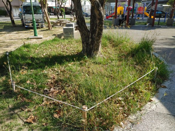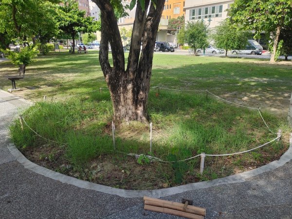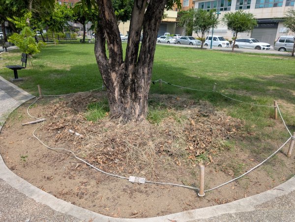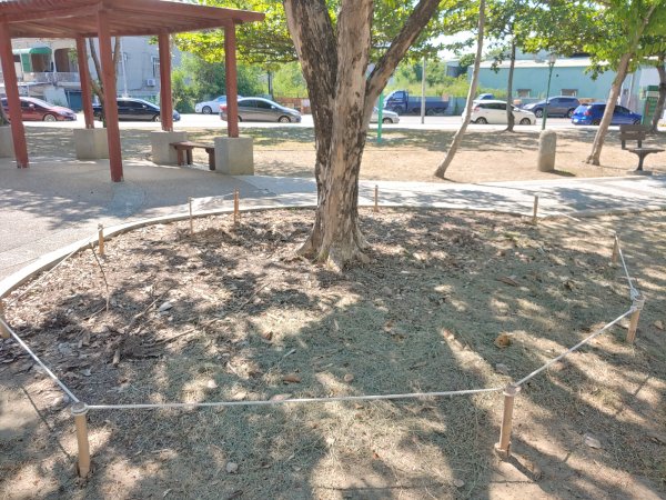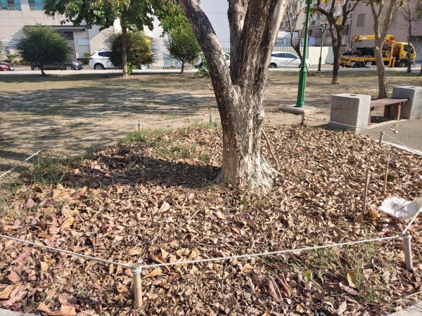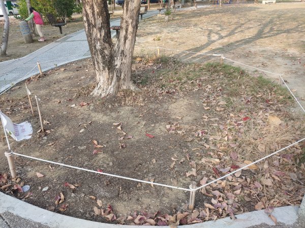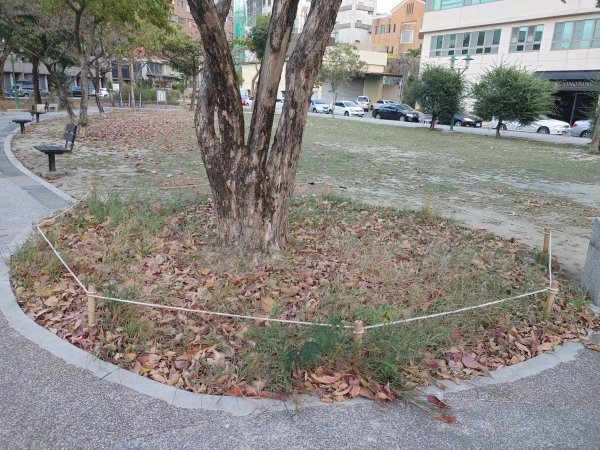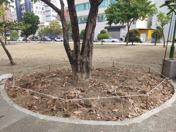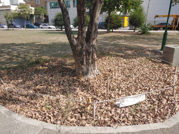 這次施作竹子圍籬的樹種是大花紫薇,在大花紫薇的樹冠旁圍起一圈的繩子,作為落葉的維護範圍。