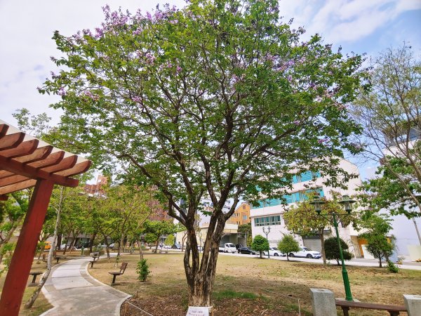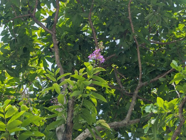 2023/0524更新觀察,大花紫薇呈現新生葉跟開花齊放的現況,底下的落葉舖設也消耗了一些,周圍有開始長出一些些草相。