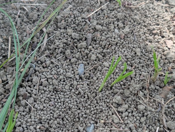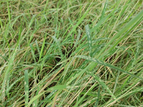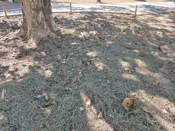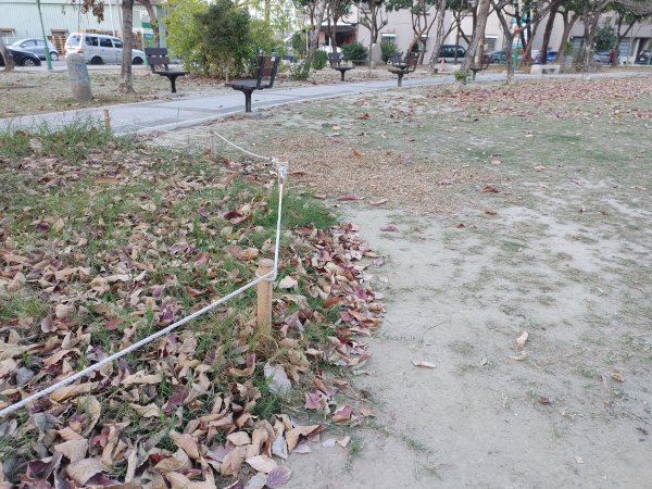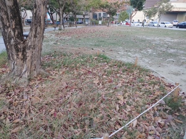 目視禾本科的草長爆整個圍籬界線,跟一旁有草相明顯不同,圍籬裡面維持有落葉放置。