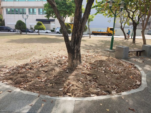 2024/0321 福安公園二期更新,竹子圍籬有損壞,葉子堆積被吹落到一角落,樹皮少部份正常脫皮,樹呈現完整的落葉現象。