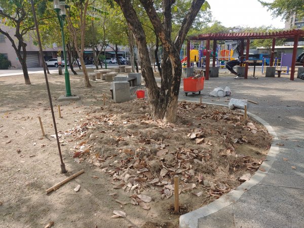 現場說明圍起範圍的用意,讓公園裡面該留在樹下的葉子跟割下的草留著,將這些放置在施作竹子圍籬的範圍裡面,在管理上也能清楚知道這邊是有人為在管理的。
