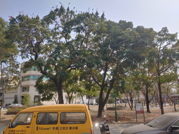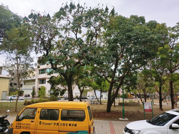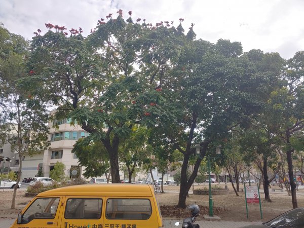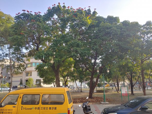 2025/0207 更新棲地拍攝。寬景觀察到火焰木是花開的季節。圍籬裡面的葉子明顯少了些,火焰木的花掉落灑在圍籬附近,其實也不用太過度的打掃。茄苳樹樹幹樹皮增生明顯,火焰木增生就少於茄苳樹。