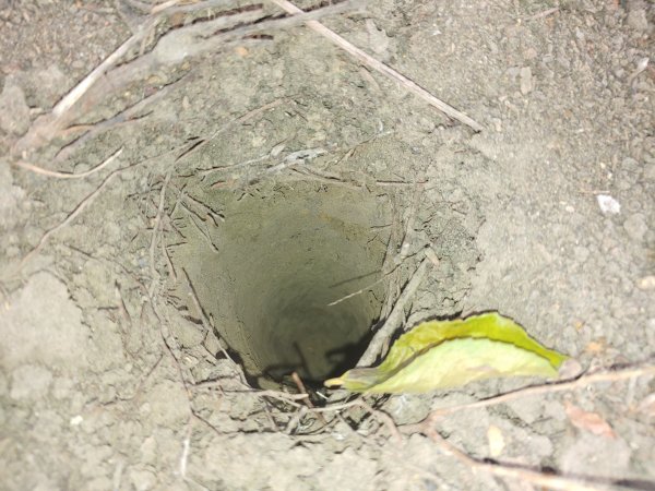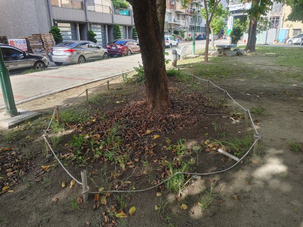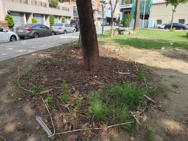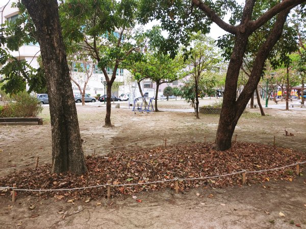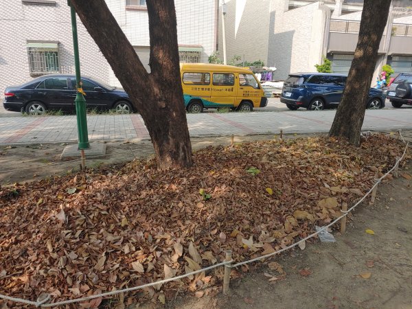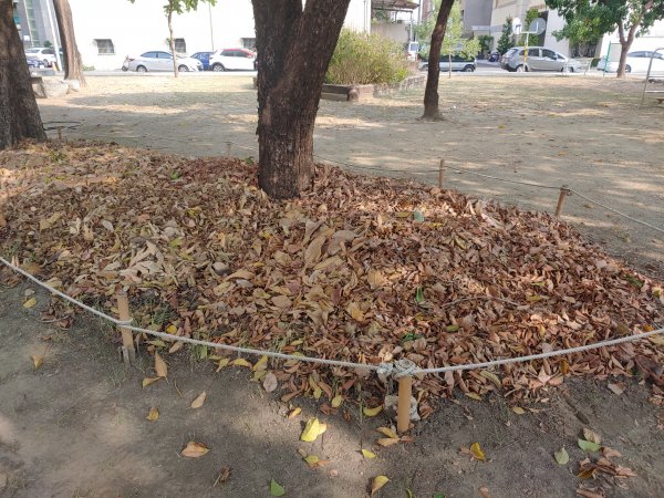 原本位置上是有一條路徑經過兩棵樹,在荒野小朋友建議之下,區公所課長里長一起幫忙,把這條硬鋪面打掉,換上新的黃土。打掉的位置上也是給這兩棵樹新的環境,也嘗試在這邊做落葉的覆蓋。增加底棲生物的活絡,幫忙表土的翻動。這樣一來落葉再也不用打包後再拿去燒掉,而且是在一個竹子範圍內將葉子歸放在裡面就可以。