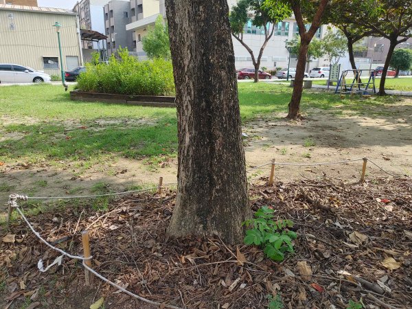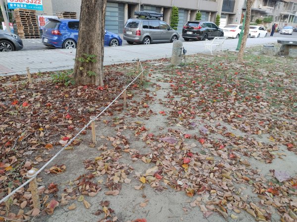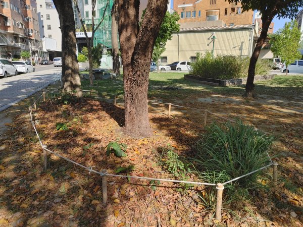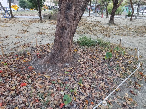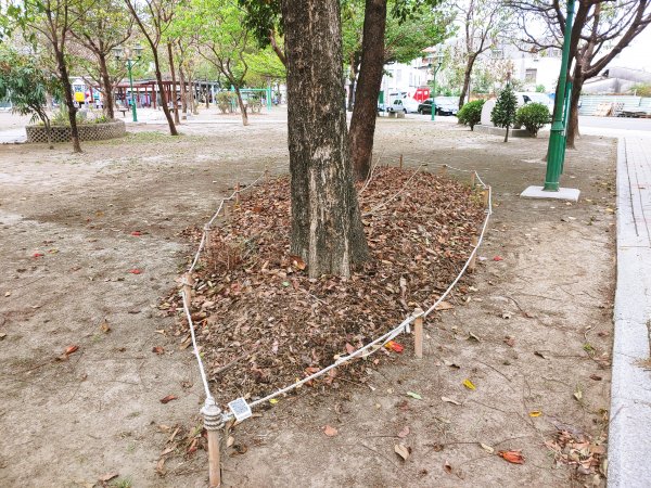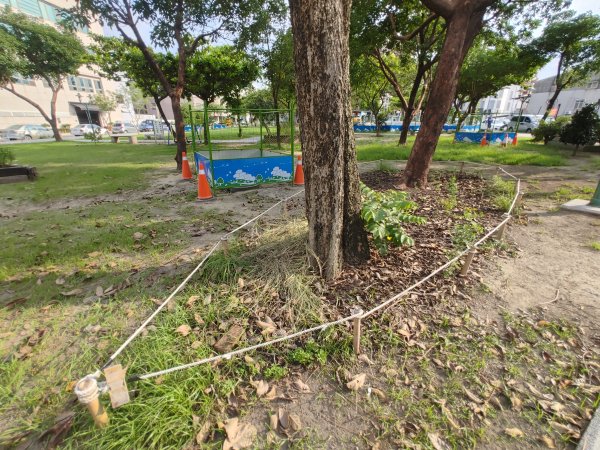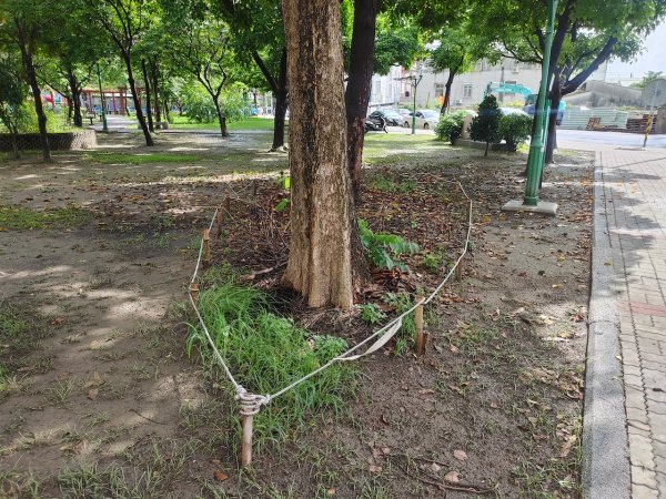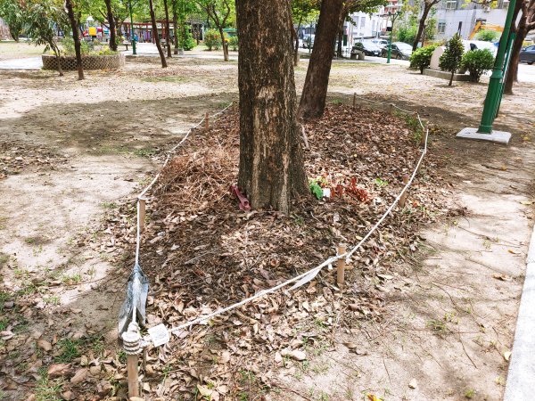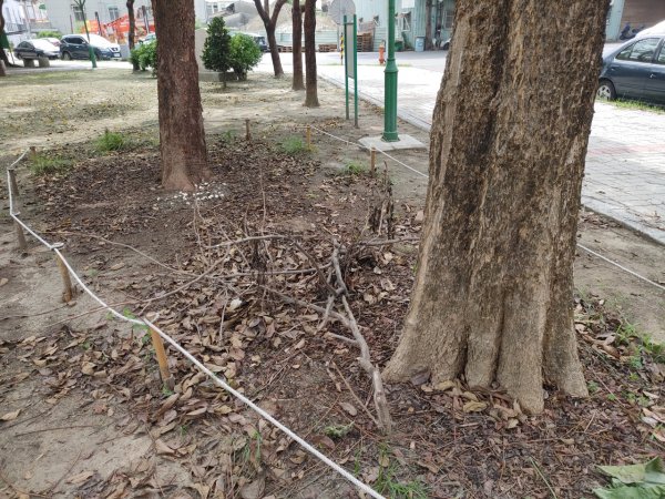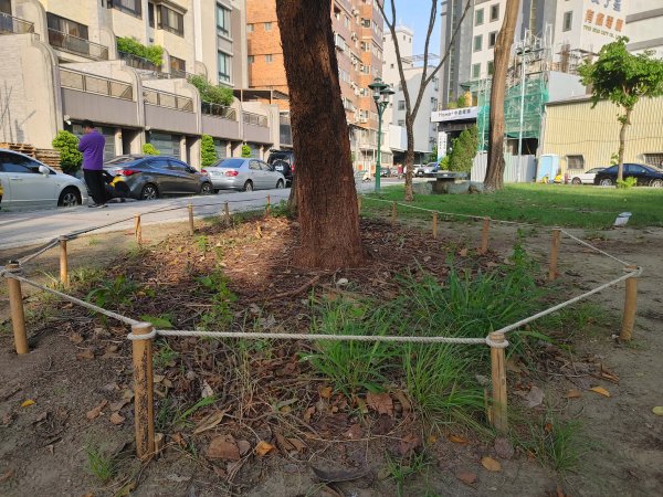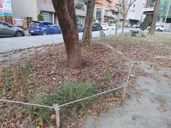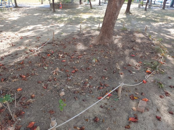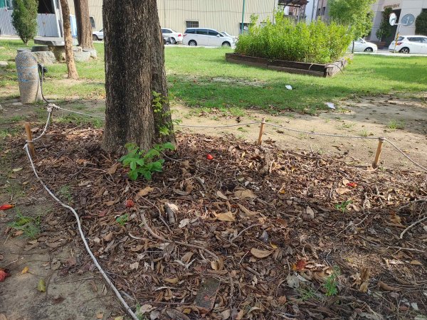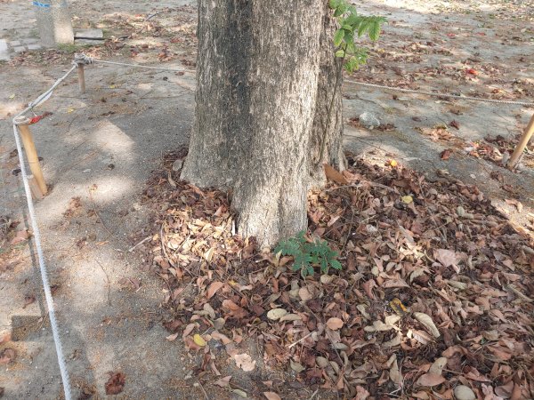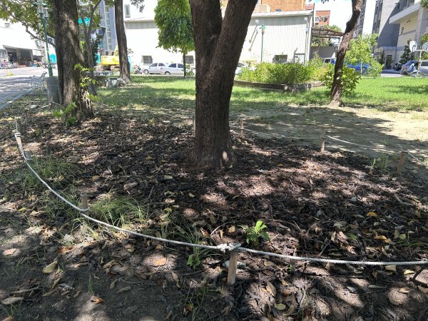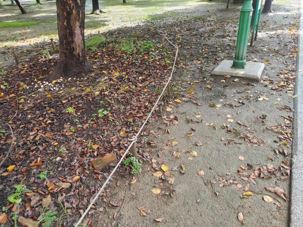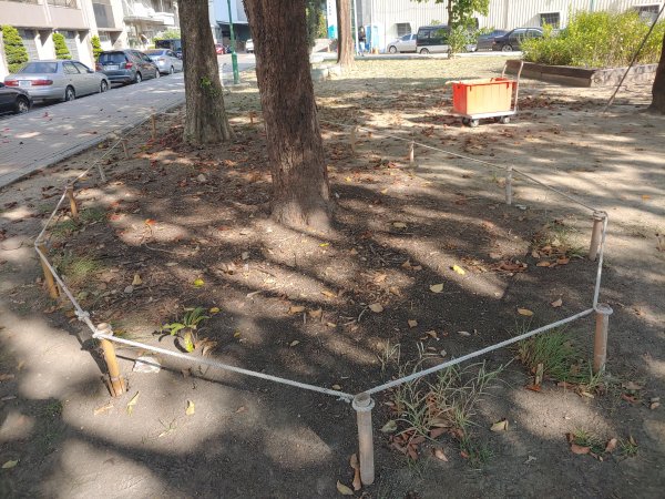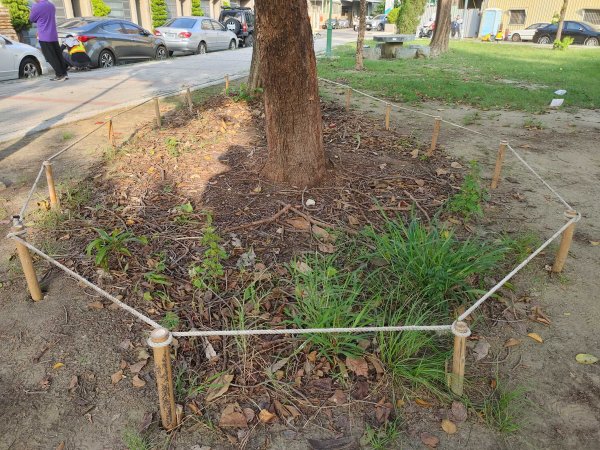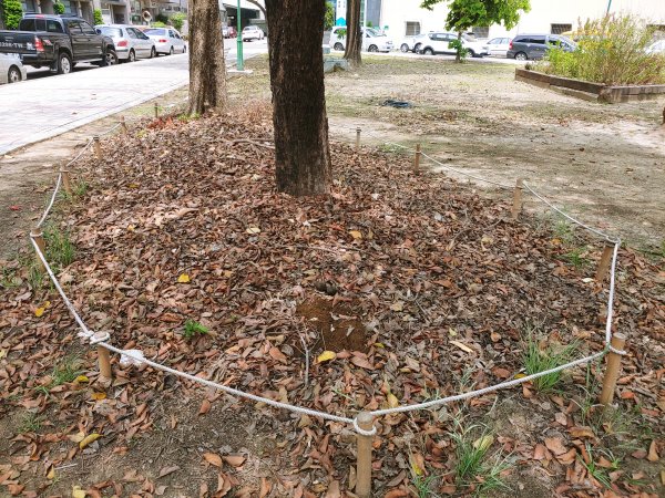 這次施作竹子圍籬的樹種是火焰木,右邊是茄苳樹,在兩棵樹冠旁圍起一圈的繩子,作為落葉的維護範圍。