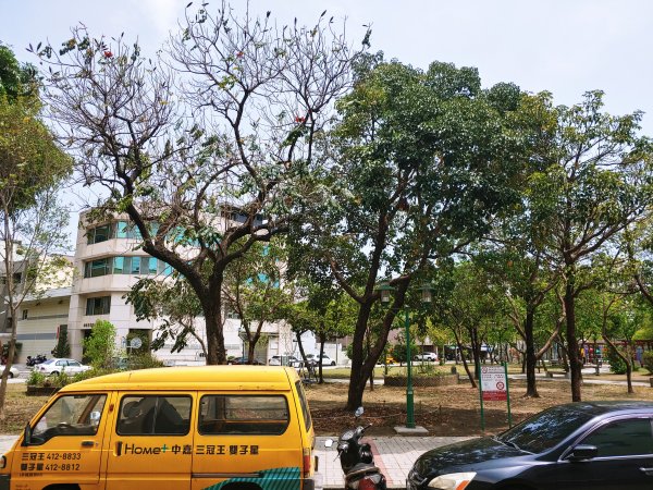 2023/0421 觀察到左側火焰木因開花結果後,葉量有減少。右側的茄冬樹葉量不變,但如果跟一旁的其他茄冬樹相比,則是葉量明顯多很多。