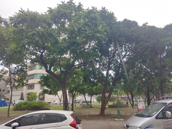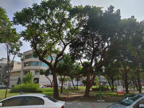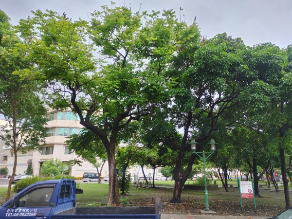 20240612 福安公園拍攝更新。去拍攝時候剛好下雨過後,可看出圍籬邊界裡面跟外面積水的差別。靠近走道處也有青苔的痕跡。六月份的火焰木明顯新葉開始生長。