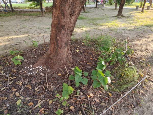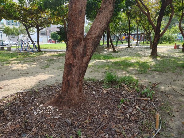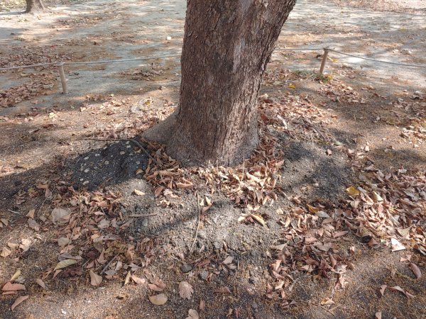 2024/1010 福安公園火焰木茄苳樹觀察。火焰木上頭有斷落的枯枝,底下則有堆置的落葉跟枝條。茄苳樹底下一樣有堆置的落葉跟枝條,推測管理者已經慢慢熟悉枝條可以放。有幾個竹子樁損壞。
