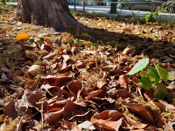 2023/0709更新觀察,火焰木葉子數量已提升,一旁的茄冬樹葉子已有黃色的落葉產生,在下午的陽光穿透之下,蓋上一片黃色的土地。