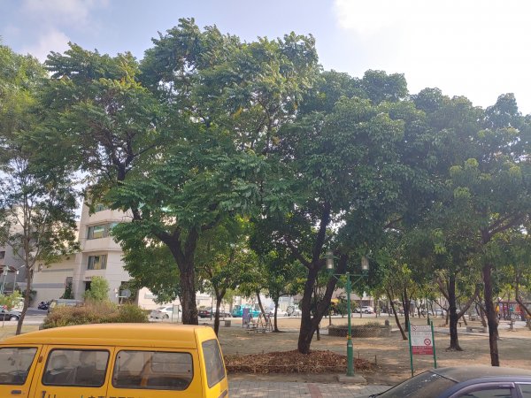2022/10/28新增:由北往南看,左邊是火焰木,右邊是茄苳樹,是在福安公園裡面施作竹子圍籬的第一版。